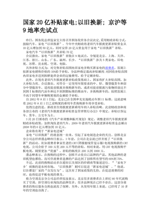 國家20億補貼家電"以舊換新" 京滬等9地率先試點