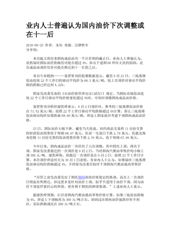 業(yè)內(nèi)人士普遍認為國內(nèi)油價下次調(diào)整或在十一后