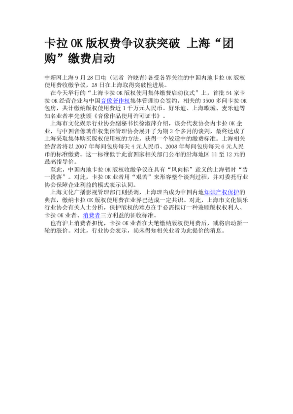 卡拉OK版權(quán)費爭議獲突破 上!皥F購”繳費啟動