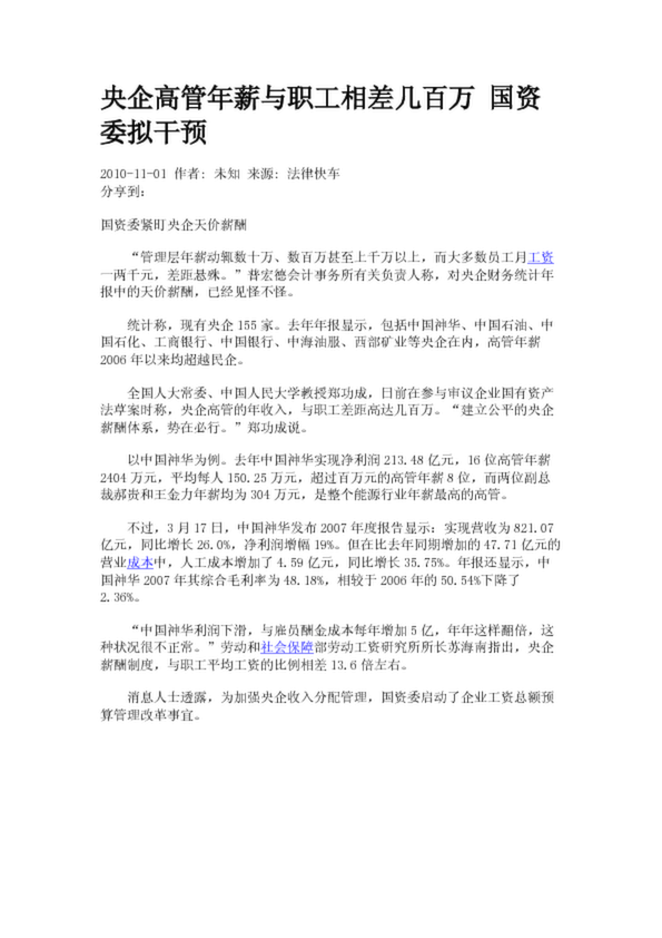 央企高管年薪與職工相差幾百萬(wàn) 國(guó)資委擬干預(yù)(3.21KB)