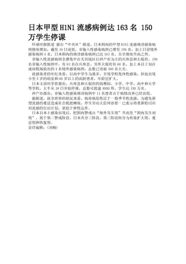 日本甲型H1N1流感病例達(dá)163名 150萬學(xué)生停課(17.79KB)