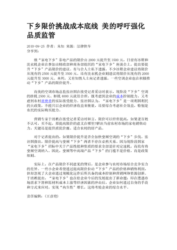 下鄉(xiāng)限價挑戰(zhàn)成本底線 美的呼吁強化品質監(jiān)管