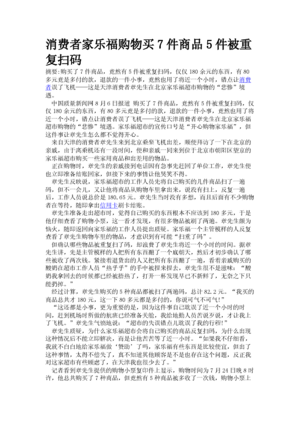 消費(fèi)者家樂福購(gòu)物買7件商品5件被重復(fù)掃碼