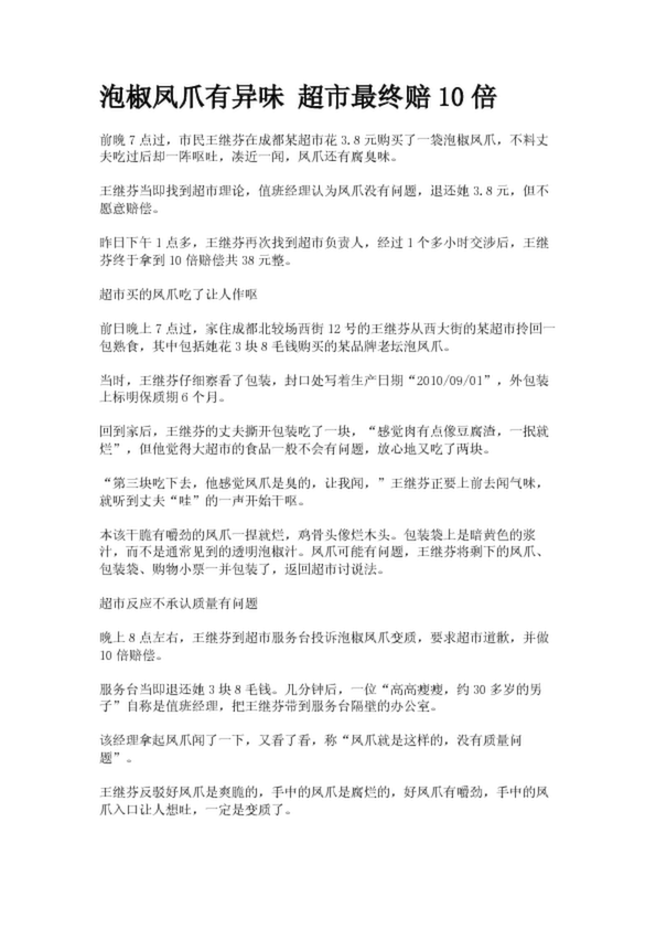 泡椒鳳爪有異味 超市最終賠10倍