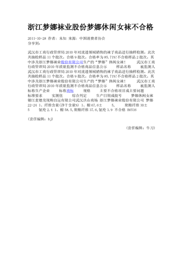 浙江夢娜襪業(yè)股份夢娜休閑女襪不合格