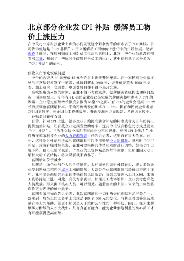 北京部分企業(yè)發(fā)CPI補貼 緩解員工物價上漲壓力