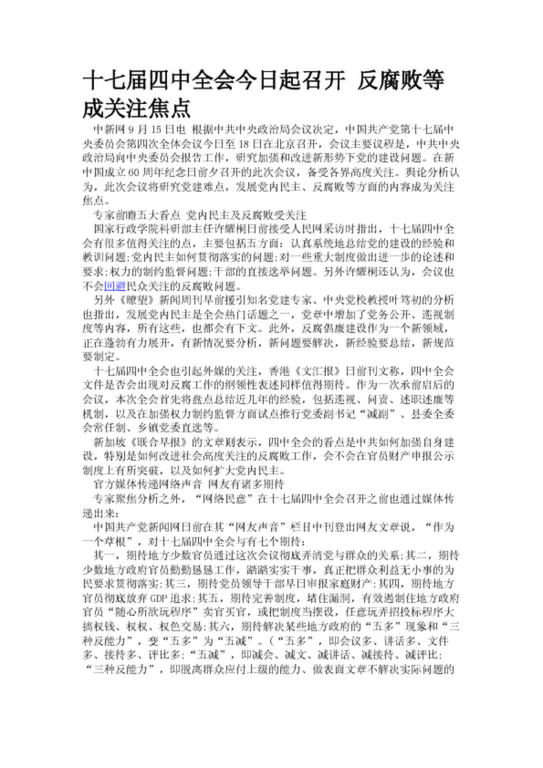 十七屆四中全會今日起召開 反腐敗等成關(guān)注焦點