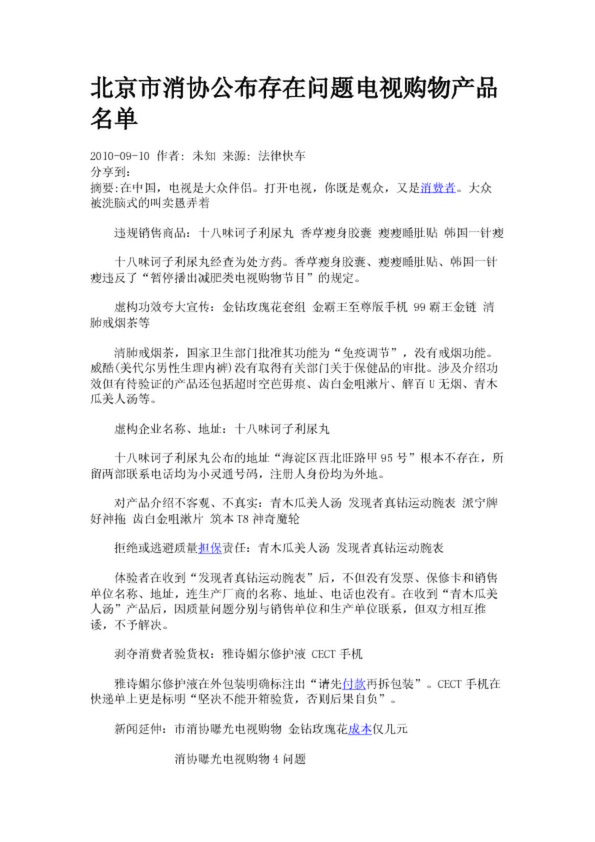 北京市消協(xié)公布存在問題電視購(gòu)物產(chǎn)品名單