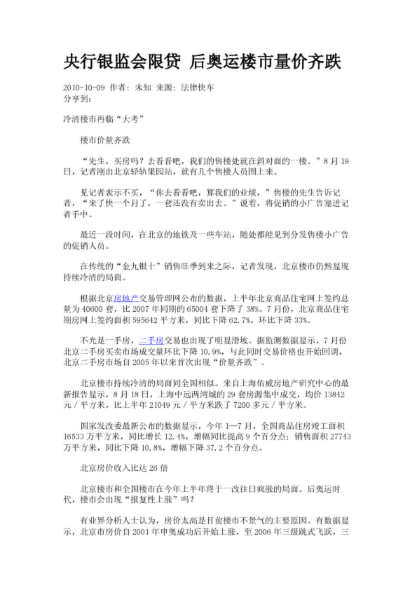 央行銀監(jiān)會(huì)限貸 后奧運(yùn)樓市量?jī)r(jià)齊跌