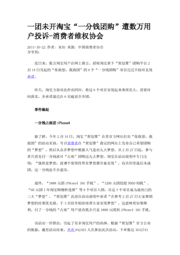 一團(tuán)未開淘寶“一分錢團(tuán)購”遭數(shù)萬用戶投訴-消費(fèi)者維權(quán)協(xié)會