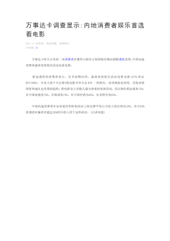萬(wàn)事達(dá)卡調(diào)查顯示內(nèi)地消費(fèi)者娛樂(lè)首選看電影