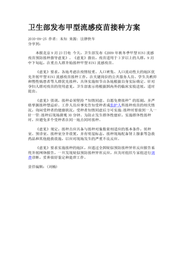 衛(wèi)生部發(fā)布甲型流感疫苗接種方案
