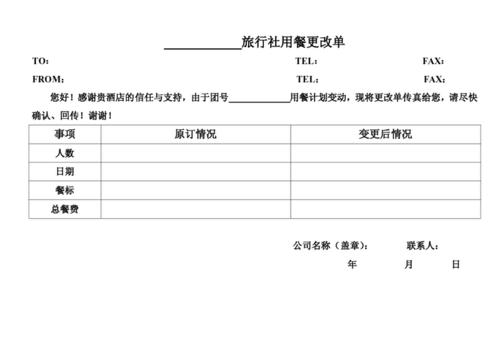 旅行社計調(diào)-用餐更改單