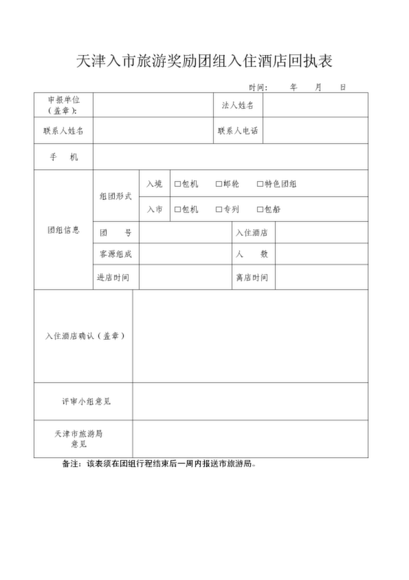 天津入市旅游獎勵團組入住酒店回執(zhí)表