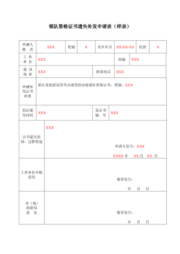 出境領(lǐng)隊證遺失補發(fā)申請表(樣表)