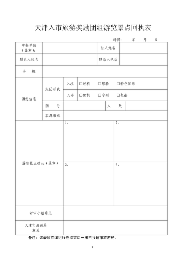 天津入市旅游獎(jiǎng)勵(lì)團(tuán)組游覽景點(diǎn)回執(zhí)表