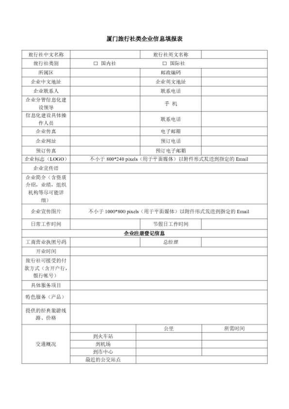 廈門(mén)旅行社類(lèi)企業(yè)信息填報(bào)表,旅行社名稱(chēng): 許可證號(hào)碼: 旅行社簡(jiǎn)介: 許可經(jīng)營(yíng)業(yè)務(wù)(入境旅游業(yè)務(wù)、國(guó)內(nèi)旅游業(yè)務(wù)、出境旅游業(yè)務(wù)、特許經(jīng)營(yíng)中國(guó)公民自費(fèi)旅游業(yè)務(wù)):