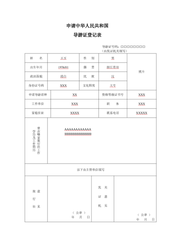 申請導(dǎo)游證登記表(天津)