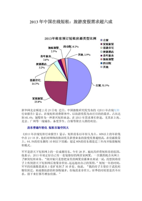 2013年中國在線短租:旅游度假需求超六成