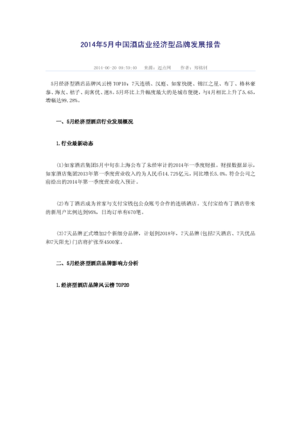 2014年5月中國(guó)酒店業(yè)經(jīng)濟(jì)型品牌發(fā)展報(bào)告
