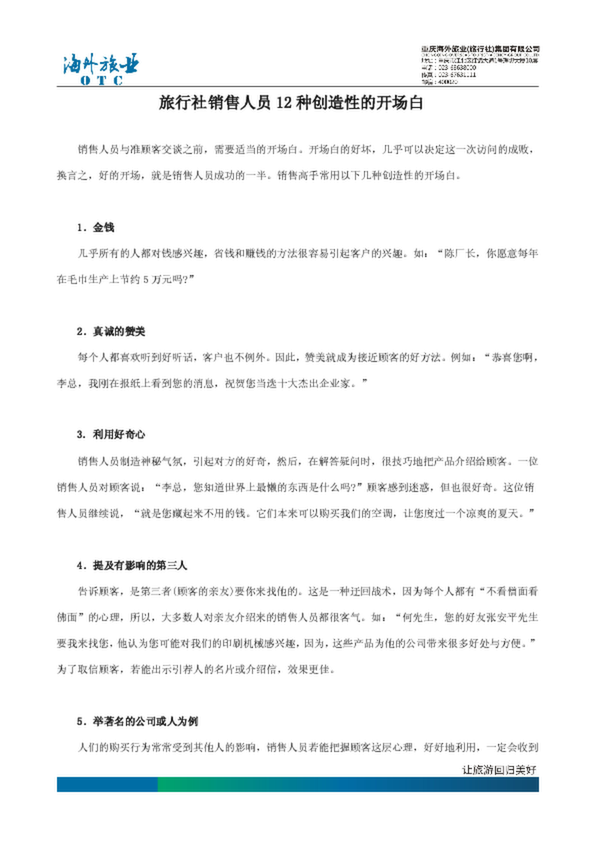 最經(jīng)典的旅行社銷售人員12種創(chuàng)造性的開場白,銷售員與準顧客交談之前,需要適當?shù)拈_場白。開場白的好壞,幾乎可以決定這一次訪問的成敗,換言之,好的開場,就是銷售員成功的一半。....