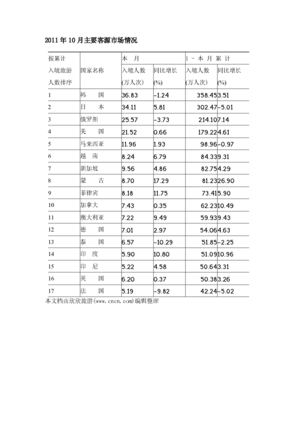 2011年10月主要客源市場情況