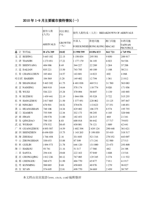 2010年1-9月主要城市接待情況(一)