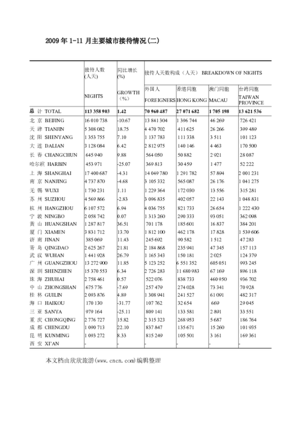 2009年1-11月主要城市接待情況(二)
