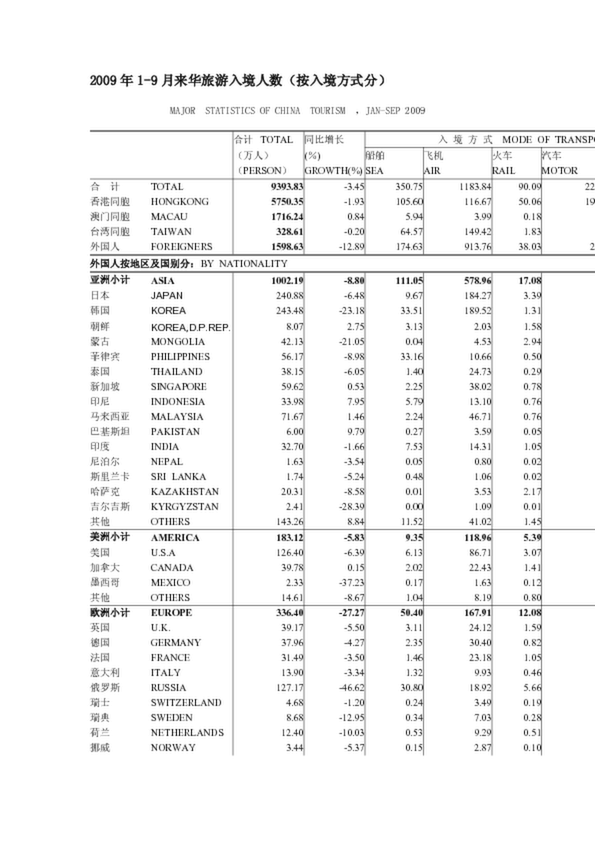 2009年1-9月來華旅游入境人數(shù)(按入境方式分)