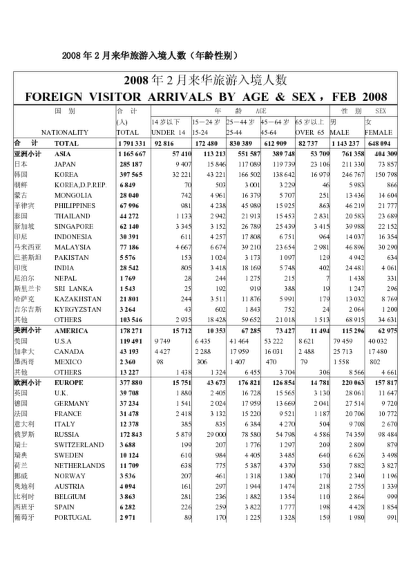 2008年2月來華旅游入境人數(shù)(年齡性別)