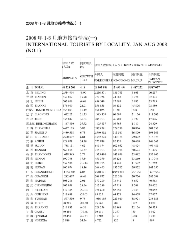 2008年1-8月地方接待情況(一)