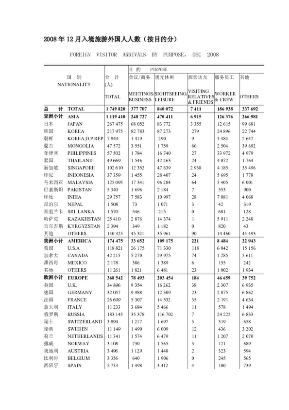 2008年12月入境旅游外國(guó)人人數(shù)(按目的分)