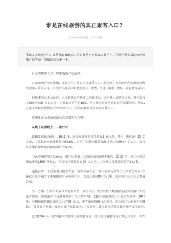 什么叫聚客入口?即聚集用戶的地方。扎根于傳統(tǒng)旅游服務(wù)行業(yè)的旅行社,是很多景點(diǎn)的流量入口。但哪里才是在線旅游的真正聚客入口呢?