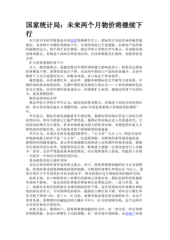 國家統(tǒng)計局:未來兩個月物價將繼續(xù)下行