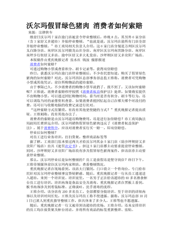 沃爾瑪假冒綠色豬肉 消費(fèi)者如何索賠